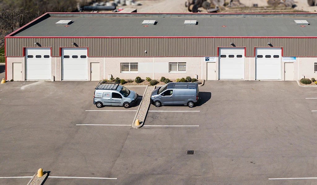 Lot 1 – Entrepôt : 100m² – Bureau et sanitaire : 20m² – 5 places de parking.